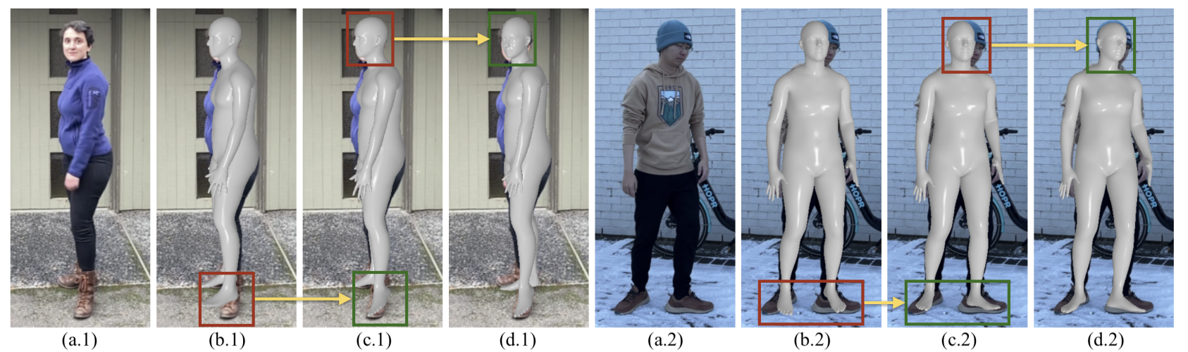 가장 왼쪽 이미지는 원본, 그 다음은 ROMP를 사용한 estimation, 그 다음은 SMPL을 통한 estimation이며 마지막은 corretion network까지 end-to-end로 학습한 결과입니다. 고개의 각도 같은 부분을 correction network를 통해 더 올바르게 보정한 것을 볼 수 있습니다.