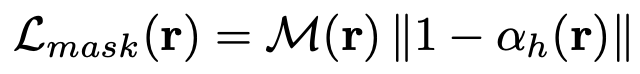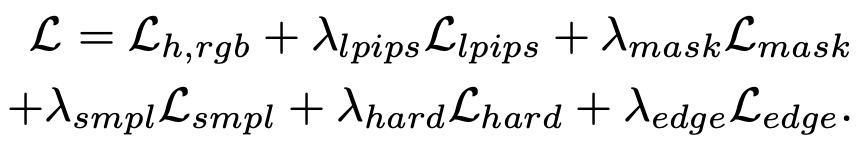 따로 식으로 적히진 않았지만 32x32 패치로 나누어 LPIPS를 계산하는 LPIPS loss도 사용했다고 합니다. 그리고 \({\alpha}_h\)는 ray 상에서 density를 누적한 값 입니다. Mask loss는 rendering 했을 때 객체가 반투명해 보이지 않도록 하게 하기 위해, human masking이 된 영역에서 density를 최대한 높게 나오도록 합니다.